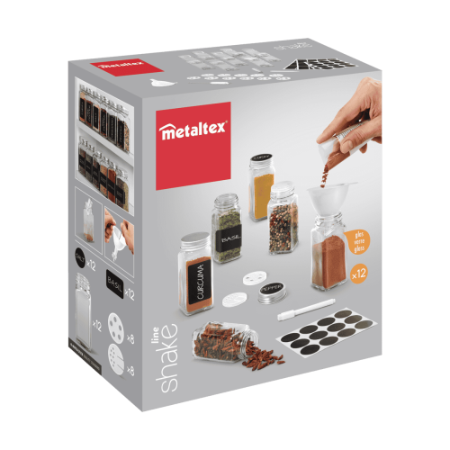 - Glass mit Drehverschluss aus Inox. Enthält: 12 Gläser mit Deckel, 16 Sieb einsätze (8 feine und 8 grobe), 24 wiederverwendbare Etiketten (rund+Eckig), 1 weissen löschbaren Marker, 1 Trichter zum sauberen Befüllen und 1 Bürste zum Reinigen. Fassungsvermögen 100ml