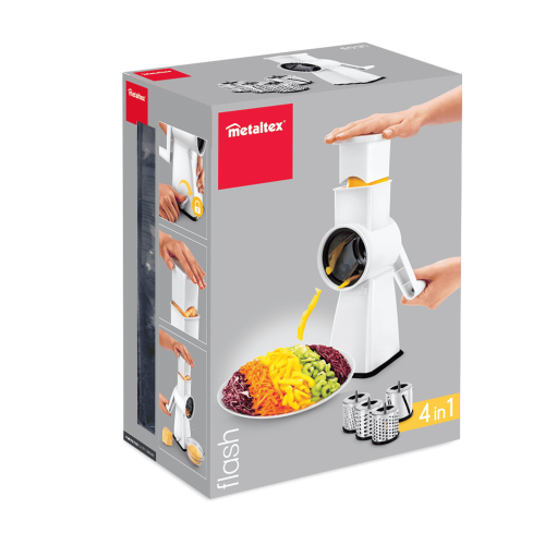 - 4 verschiedene Einsätze zum Raspeln, Schneiden und Zerkleinern von Gemüse, Käse, Nüssen, Schokolade, etc.