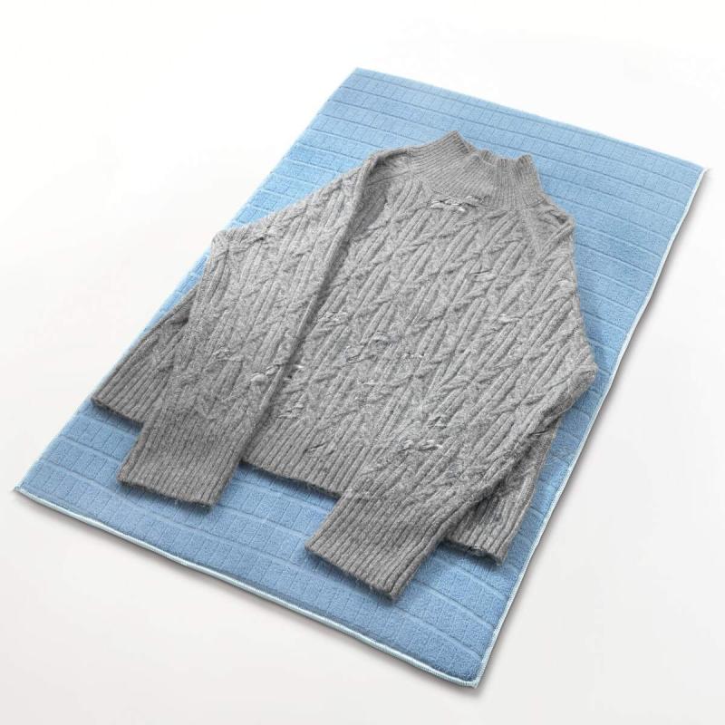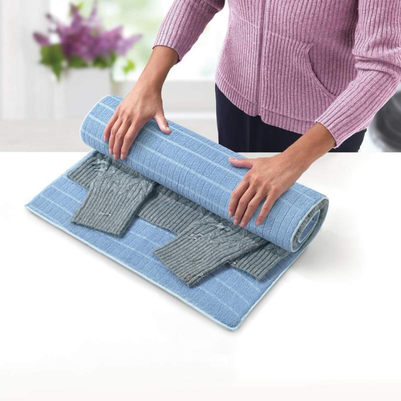 - Das Kleidungsstück auf die Matte legen, sanft einrollen, um überschüssiges Wassser aufzusaugen, und zum vollständigen Trocknen wieder flach auslegen