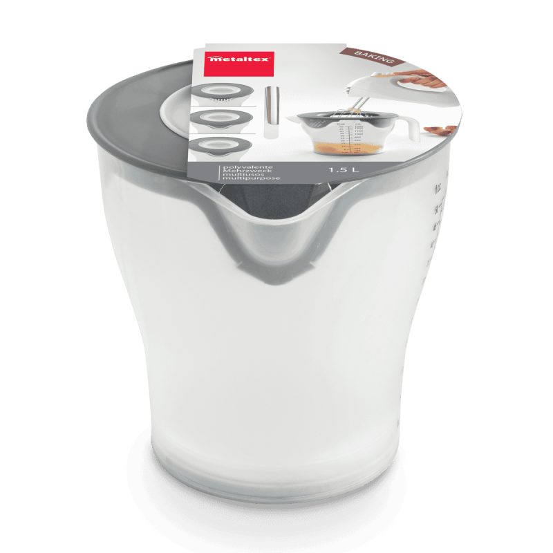 - Inkl. Spritzschutz mit zwei verschiedenen Siebeinsätzen und luftdichtem Deckel