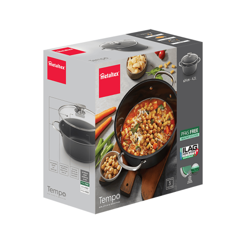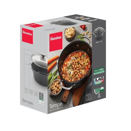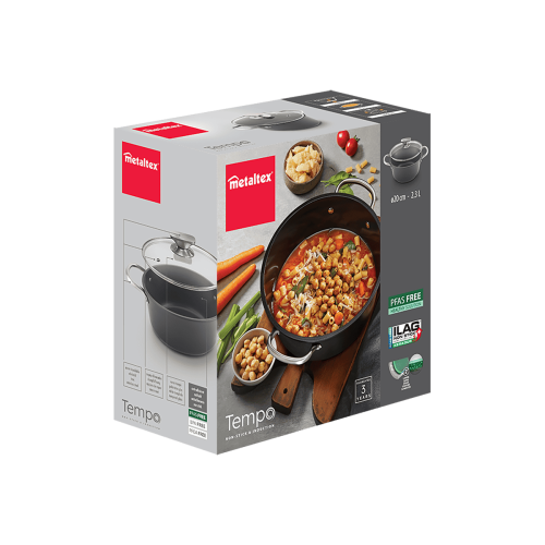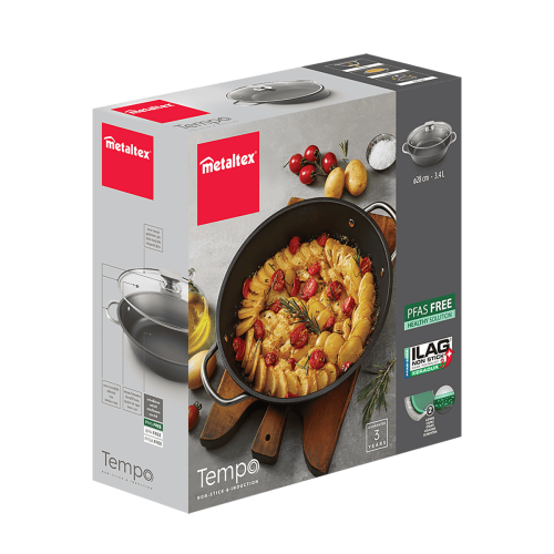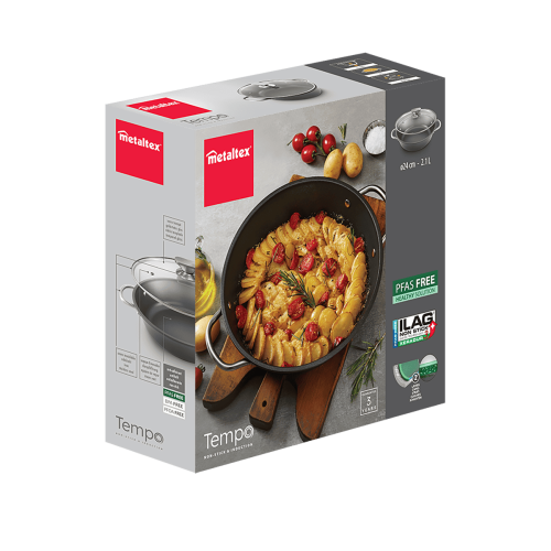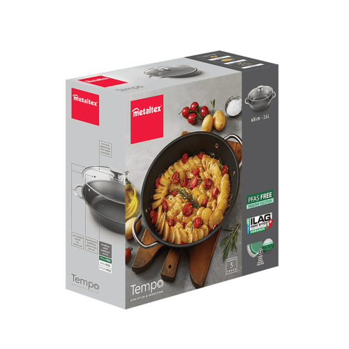 - Base universal válida para todo tipo de cocinas: inducción, vitrocerámica, halógena, eléctrica y gas. También apta para su uso en horno hasta 250ºC (tapa de vidrio no adecuada)