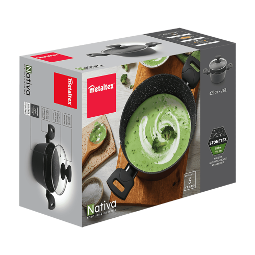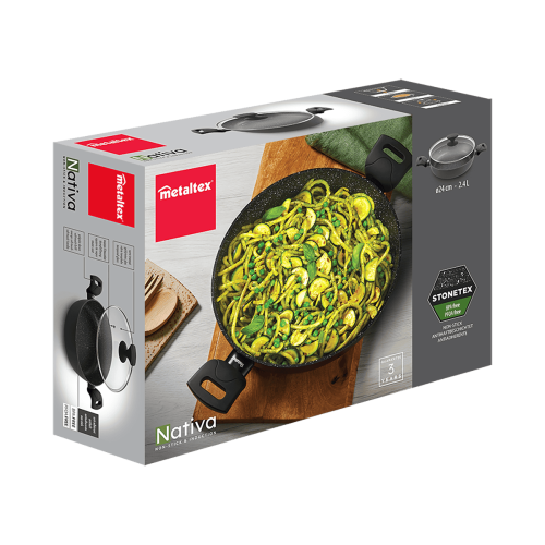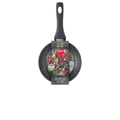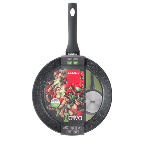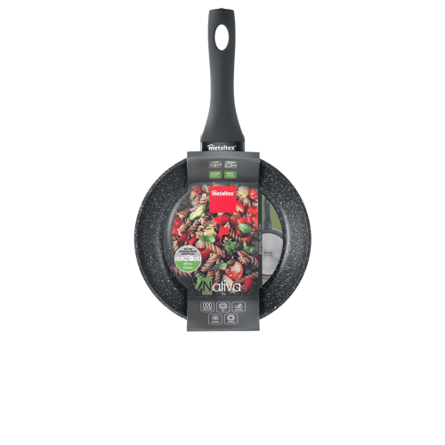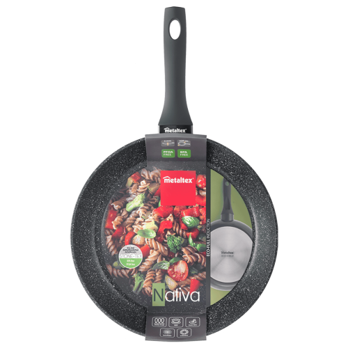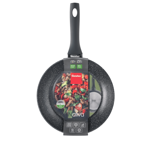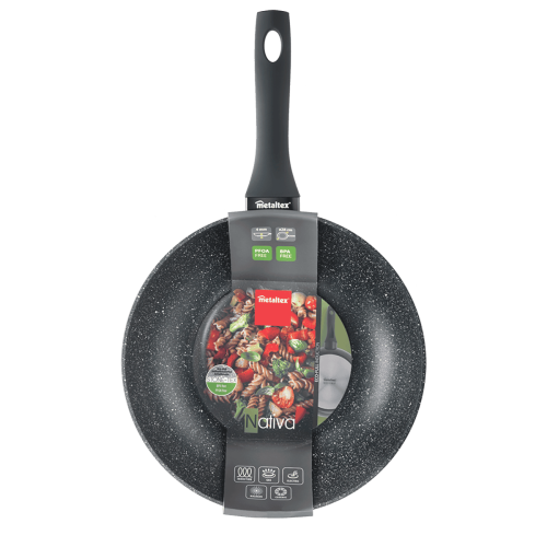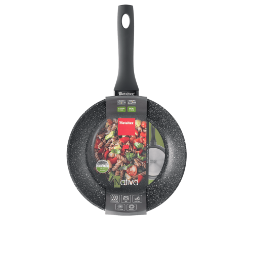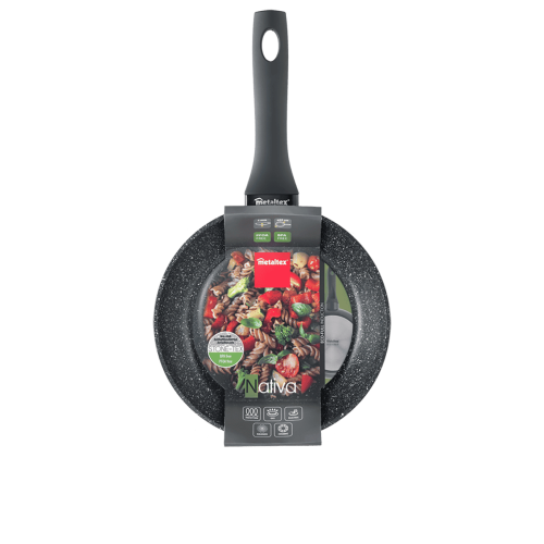 - Cuerpo aluminio forjado con base full induction de 4 mm de espesor adecuada para todo tipo de cocinascon revestimiento antiadherente PTFE 2 capas Stonetex efecto granito