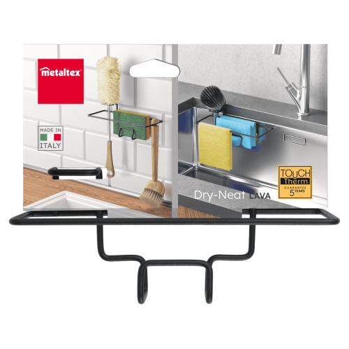 - Se fija con 2 ganchos autoadhesivos y puede colocarse tanto dentro como fuera del fregadero